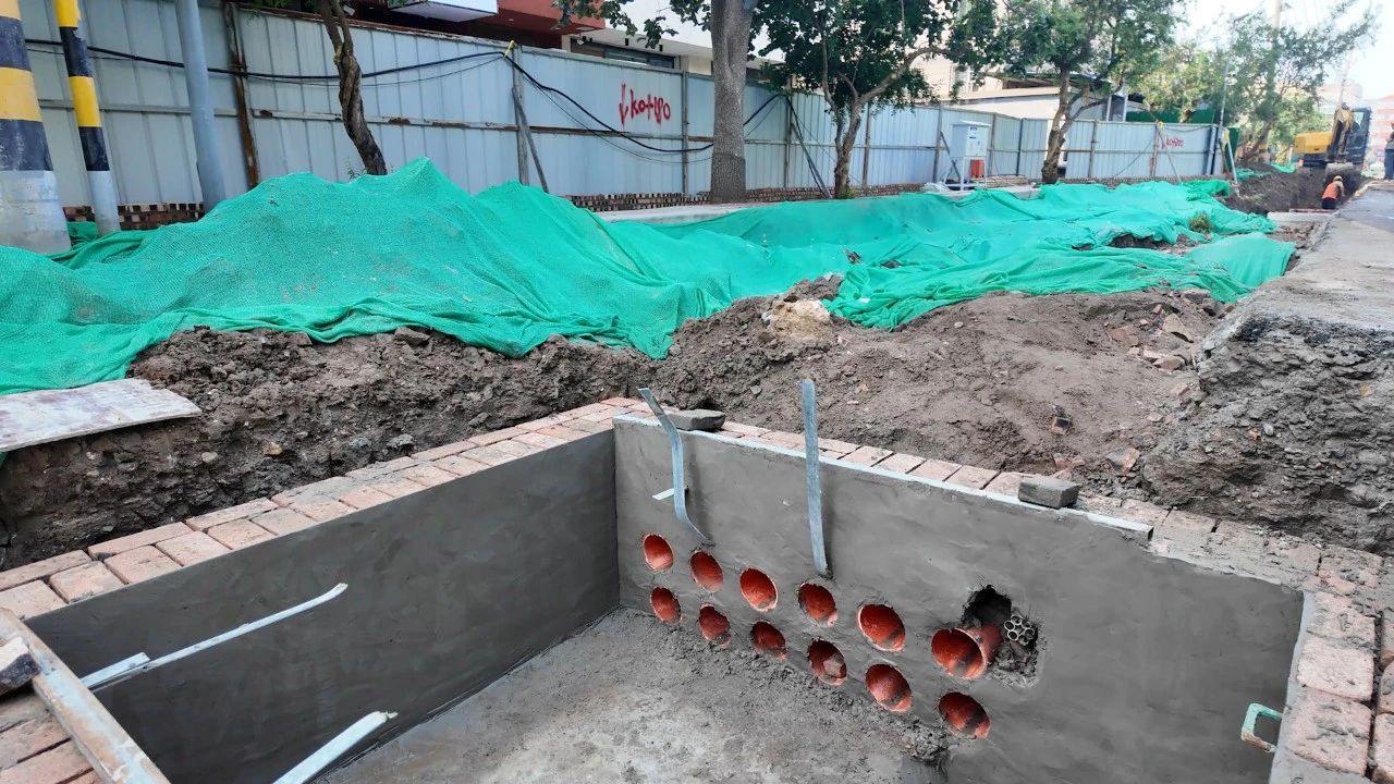 花果街項(xiàng)目正進(jìn)行電力排管及電力檢查井施工,下一步進(jìn)行跨路電力排管及雨水支管施工。待地下管線全部施工完成后進(jìn)行主車道路槽平整,級(jí)配砂礫攤鋪等工序。